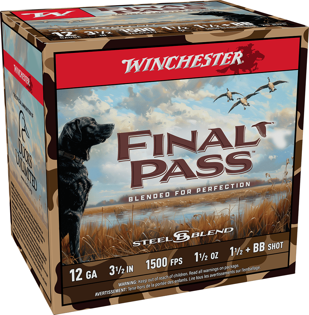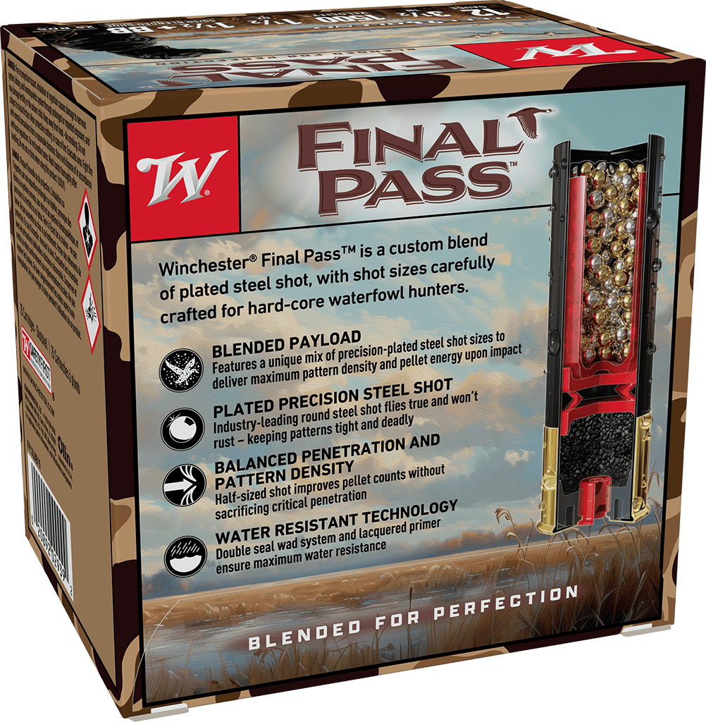 The all-new Winchester Final Pass™ Waterfowl Ammunition blends innovation and tradition, delivering superior manufacturing quality with a custom blend of plated precision steel shot sizes for maximum pattern density and pellet energy. Featuring half-sized shot for balanced penetration and increased pellet counts, along with a double seal wad system and lacquered primer for maximum water resistance, Final Pass ensures tight, deadly patterns in the harshest conditions.