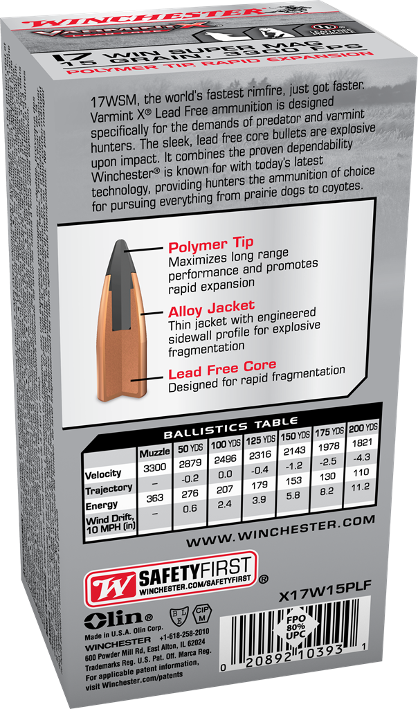 17WSM, the world’s fastest rimfire, just got faster. Varmint XP Lead Free ammunition is designed specifically for the demands of predator and varmint hunters. The sleek, lead free core bullets are explosive upon impact. It combines the proven dependability Winchester is known for with today’s latest technology, providing hunters the ammunition of choice for pursuing everything from prairie dogs to coyotes.