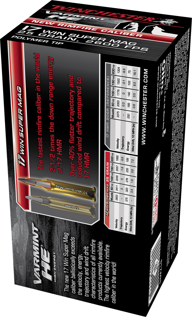 + Free ShippingThe new 17 Win Super Mag caliber ballistically exceeds the velocity, energy, trajectory and wind drift characteristics of all rimfire products currently available. The highest velocity rimfire cartridge in the world!