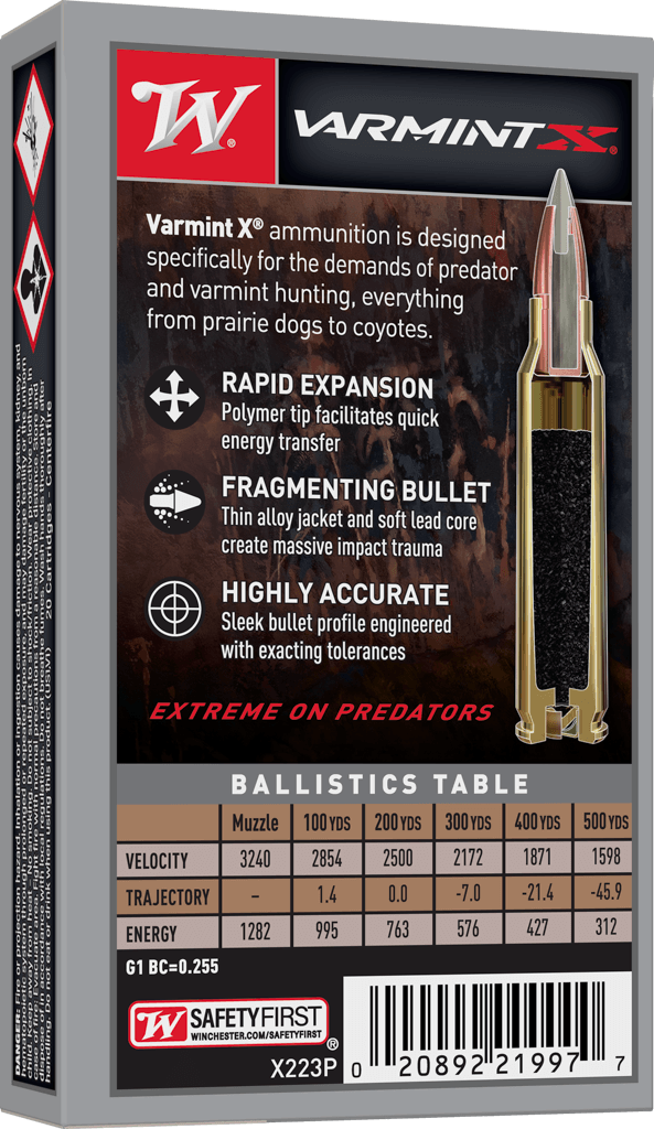 Varmint X is designed specifically for the demands of predator and varmint hunters. The sleek, polymer-tipped bullets are explosive upon impact. Varmint X combines the proven dependability Winchester is known for with today’s latest technology, providing hunters the ammunition of choice for pursuing everything from prairie dogs to coyotes.